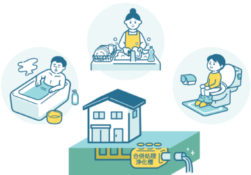 トイレの汚水(黒水)、台所・浴室・洗面所などの生活排水(生活雑排水)を まとめて処理できる浄化槽 です。従来はトイレの汚水だけを処理する単独浄化槽が多く使われていましたが、生活排水による水質汚濁が大きな問題となり、現在では ほとんどの地域で合併浄化槽の設置が標準 になっています。